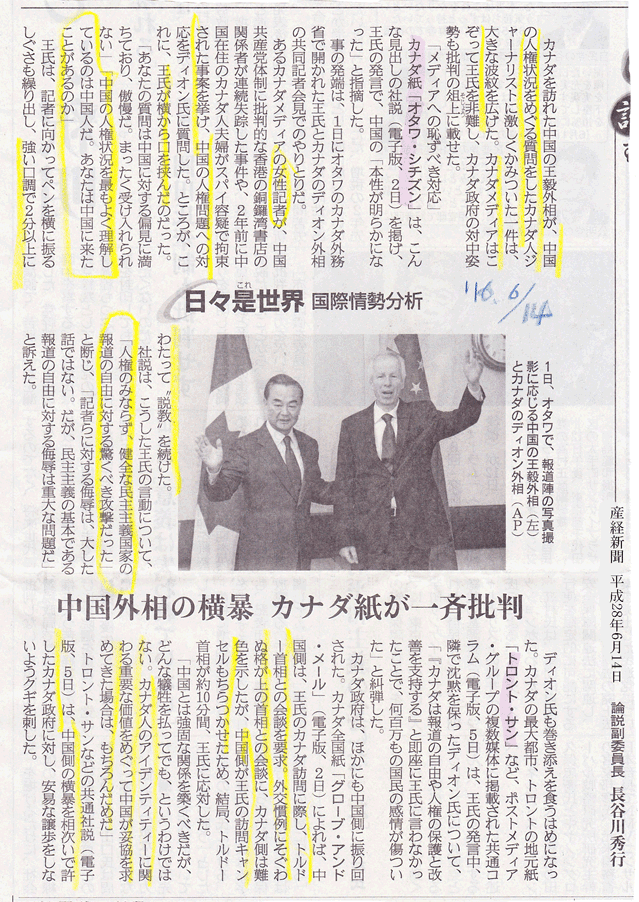 | カナダ&中共 | [2016] 平成28年6月1日 | カナダで中共・王毅外相、女性記者の質問に激高、延々"説教"を垂れる!クリック |