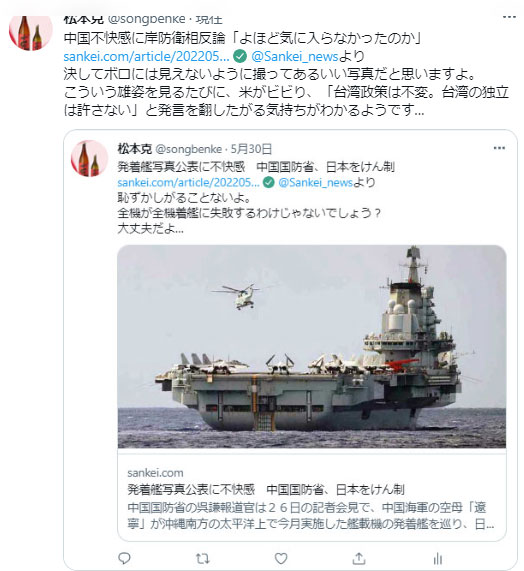 | 2018. 1/11 | 尖閣接続水域に中国潜水艦が潜行、中国水上艦も 中国外務省「日本側の活動を追跡した」 小野寺五典防衛相[潜航した潜水艦と中国艦艇が同時に接続水域に入ったのは初めてだ]… クリック | |