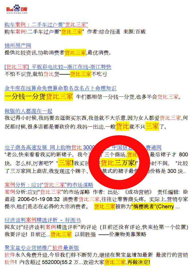 …と思ったら、大陸ではすでに“貨比三万家”まで行ってました…(以下の検索画面参照)