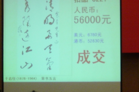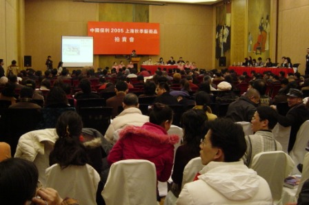 上海でオークション(拍卖)を見て来ました。 今年もいよいよあと1日となりました。東京証券取引所は今日大納会を迎え、年初からの値上がりが40%以上だったと景気のいい話をしています。企業の業績が目に見えて良くなっているようですが、皆さんの暮れのボーナス(奖金;年终奖;年终奖金)はいかがでしたか?企業業績が上がっているということで、きっと皆さんも大もうけしたのではないでしょうか?大もうけした後の悩みと言えば、その使い方ですよね。住んでいる家が姉歯の設計でない人々は、帰郷してのんびり家族奉公、年末年始の海外旅行と、快い忙しさに追われているのではないでしょうか。使い切れない分はどうしますか?貯金とか株や債権、最近は投資信託というのも多くなってきたようですね。その他、不動産とか美術品はどうでしょう?少なくとも私の周囲には多くないのですが、美術品のコレクターあるいは投資家というのは日本には多いのでしょうか少ないのでしょうか? 今回の上海出張で驚いたのは、中国の美術品オークション市場が想像以上に活気が有ったことです。ちょっと前、日本でも報道されたことがありますが、温州の小企業主の集団が北京や上海の高層マンションを投機目的で買い漁っていたという話が有りました。投機が目的ですから、儲かるとなるとすぐに売りますよね。所謂「不動産転がし」です。日本の不動産バブルが懐かしいですね。日本のバブル経済(泡沫经济)は中国でも有名ですから、中国政府は“以史为鉴,面向未来”(歴史を鑑として未来に向かえ)とばかりに、日本のバブル崩壊を歴史の鑑として不動産市場に規制を加えました。購入後の一定期間は転売を許さない等々の規制です。こうして、不動産が転がし難くなったことも後押ししているのではないかということですが、今回参観した上海のオークションは大変盛り上がっていました。 会場は、名前を聞けば、知らない人以外は誰でも知っているような西洋系ホテル。2階の吹き抜けのぐるりが商品の展示場となっており、展示の一角から奥へ進むとオークション会場のホール。この日のオークションは、主に清時代以降現代に至る典型的中国書画、中国人画家の手になる油絵、極少数のブロンズ像を対象に朝から晩までを三回に分けて売買が行なわれます。オークション会社にも得意不得意が有るようで、当日のオークション会社は陶磁器類は扱わないようでした。それでも各回毎のカタログはそれぞれ別々で、キロ(kg)単位の分厚いカタログが3部揃わないと当日の商品全てをフォローできません。また、売買に参加しない人でも、何の手続もせずに自由に展示場を見て回り、奥のオークション会場へも入って売買を生で見学することができます。そう言えば、通路に置いてあったコーヒーだってセルフ・サービスとは言え無料。日本のオークションもこんなに自由なの?と不思議な気がしましたが、嘘でも何でもありません。 オークション会場の初期設定の椅子と時間、進むにつれて追加された椅子の数、立ち客の散らばり具合等から察するに、参加者、見学者は五百人くらいだったでしょうか。会場の前方、横向きで一段高くなっている席は委託席、オークション会社の社員が電話で客の委託を受けて現場の客と値を競う所です。会場で手に番号札を持っている人は入場時に保証金を積んだ競買人。若いアベックが途中から隣の隣の席に来て、実際に札を上げて競買に参加していたけど、一体何者だろう?誰かの代理かしら?楽しそうに相談しながら札を上げていたところを見ると、自分たちのお金で参加しているのかな?二人の関係はどこまで行っているのか等、いろいろなことを考えさせられます。 その時の私のメモに「跳2000」「跳5000」「跳1万」というのが有ります。一番一般的に思えたのでわざわざ書き留めなかったのが「跳1000」。もしかすると、「跳500」も有ったかもしれませんが、有ったとしても極極僅かだったはずです。何の数字かというと、値を上げていく幅のことです。例えば、今誰かが10,000元(=人民元;RMB)と値を付けている商品を自分が競り落としたければ、相手を上回る値を付け続け、最終的には相手を諦めさせなければなりません。そこで、どれだけの幅で上乗せしていくかということになります: 「跳1000」ならば、10,000+1,000=11,000元 「跳2000」ならば、10,000+2,000=12,000元 「跳1万」ならば、10,000+10,000=20,000元 という単位で値が付けられ競り上がっていくのです。 「中産階級」と定義される人の月給が「5,000元」で、全人口の中で多くても20%に満たないという国柄ですから、一瞬にして1,000元上がり、2,000元上がりしていく様はまるで別世界のようです。しかし、上にも書いたように若いアベックもそういう単位で動く取引に参加しているのです。日本では、オークションで競り落とした商品は一年以内に再びオークションに売りに出してはいけないというような掟も有るらしいのですが、中国ではどうなのでしょう